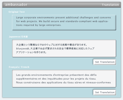 The web is a global marketplace, and modern business sites need to be ready to handle multiple languages from the start. Yokohama not only supports all the languages of the world, but it offers Ambassador - an online translation management console.